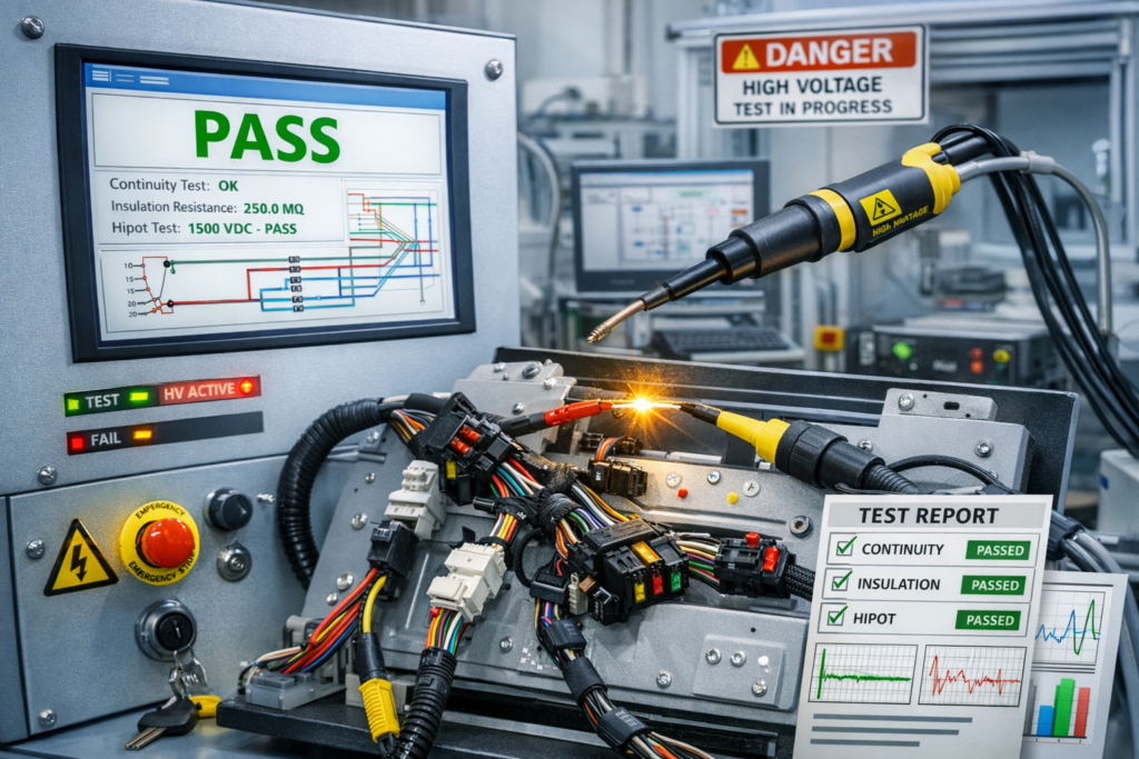 Üretimde kablo/harness montajından sonra en kritik adım, doğru pin–doğru bağlantı kontrolüdür. Kablo Bağlantı Doğrulama Test Sistemimiz; kablo demetlerinde ve kablo setlerinde açık devre, kısa devre, yanlış bağlantı, çapraz bağlantı, ters pinleme gibi hataları otomatik olarak tespit eder. İhtiyaca göre izolasyon (IR) ve hipot (HV) testleriyle elektriksel güvenliği de doğrular. Sonuçları PASS/FAIL olarak anlık verir, test verilerini kayıt altına alarak izlenebilirlik sağlar.